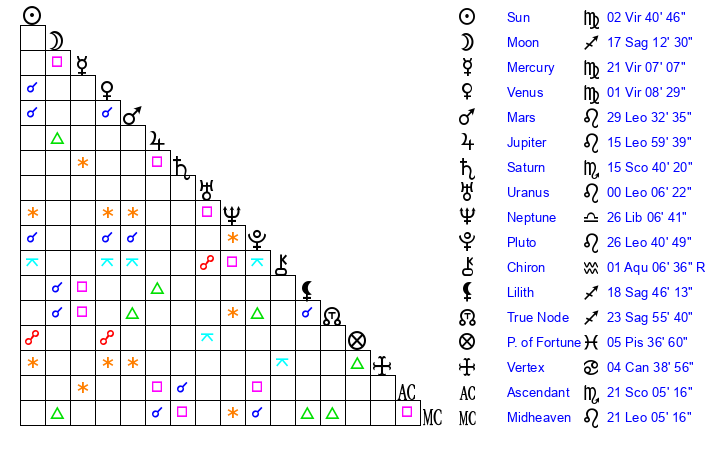 | Sun | 2 Virgo 40 | 3 Virgo 42 | 11 Scorpio 30 |
