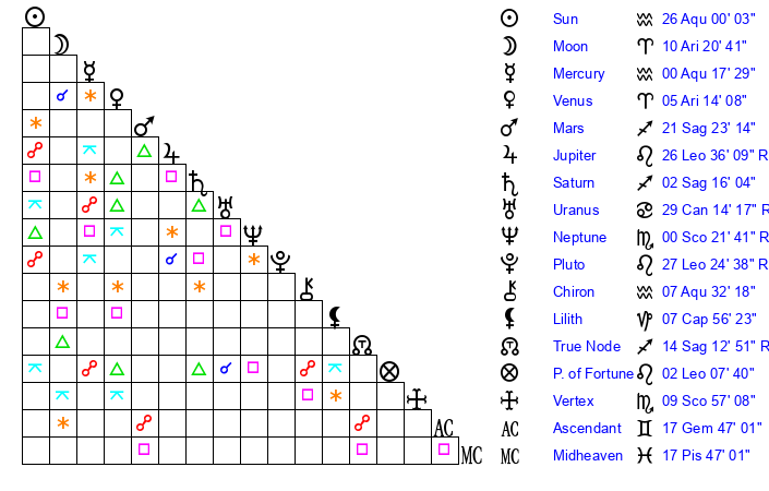 | Sun | 26 Aquarius 0 | 27 Aquarius 16 | 4 Taurus 28 |