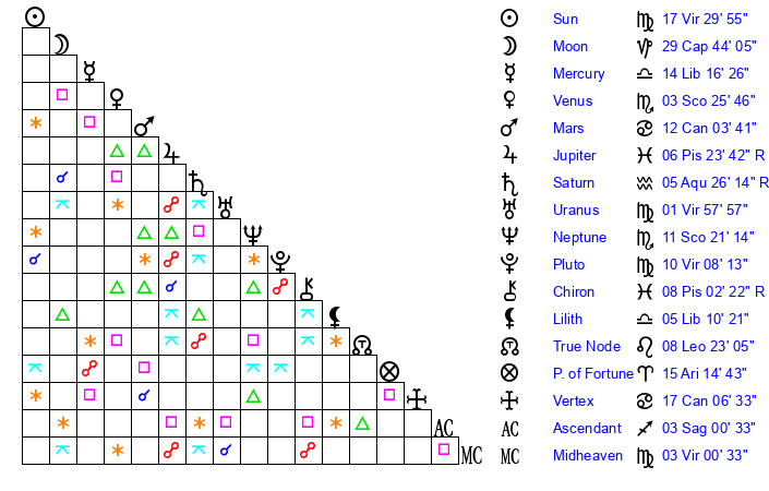 | Mercury | 14 Libra 16 | 15 Virgo 44 | 12 Scorpio 22 |