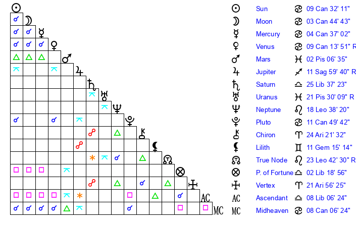 | Moon | 3 Cancer 49 | 27 Virgo 56 | 21 Pisces 26 |