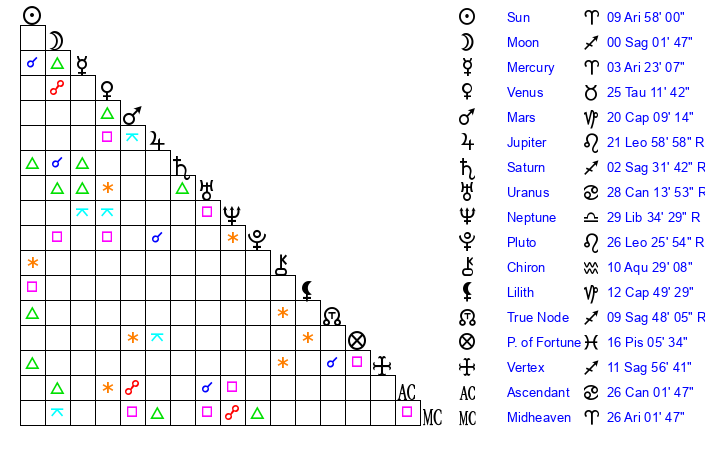| Saturn | 3 Sagittarius 0 | 24 Pisces 15 | 28 Scorpio 42 |