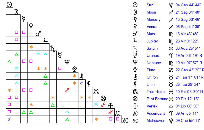 | Mars | 16 Virgo 43 | 8 Capricorn 38 | 1 Virgo 59 |
