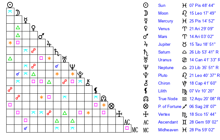 | Neptune | 23 Libra 35 | 28 Pisces 48 | 21 Libra 48 |
