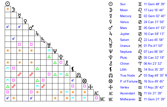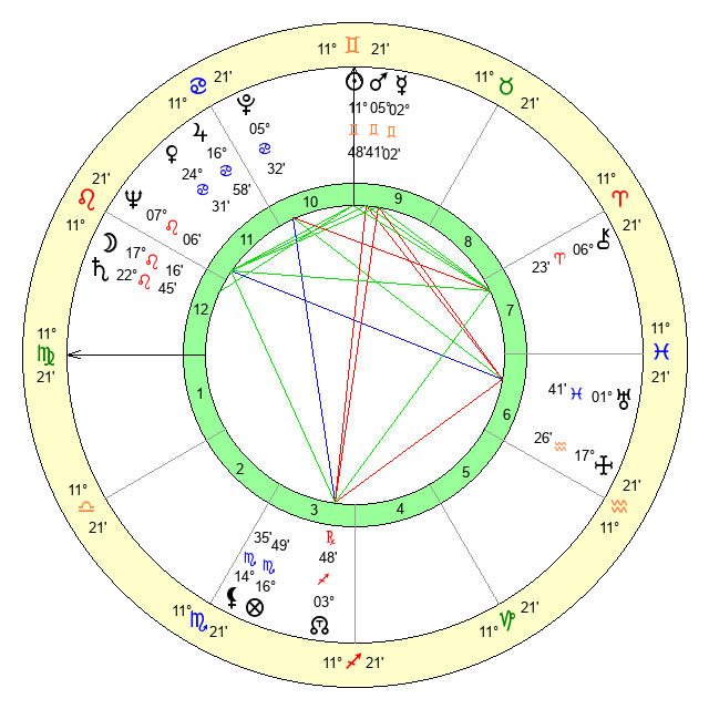 Sun | 11 Gemini 48 | 13 Gemini 8 | 23 Virgo 29 |
