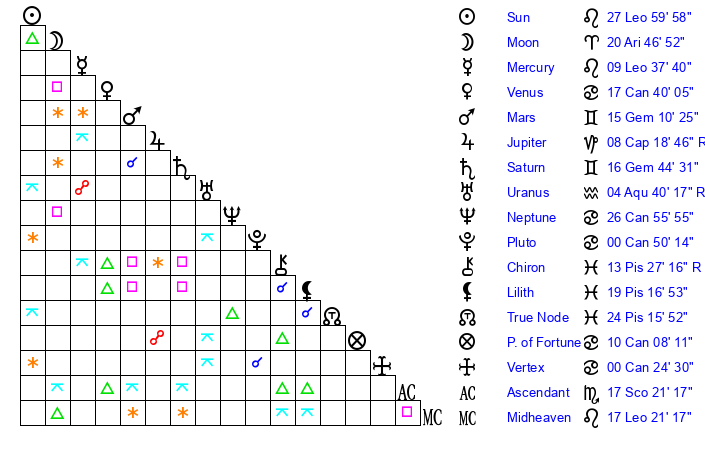 | Moon | 20 Aries 44 | 9 Leo 47 | 26 Taurus 13 |