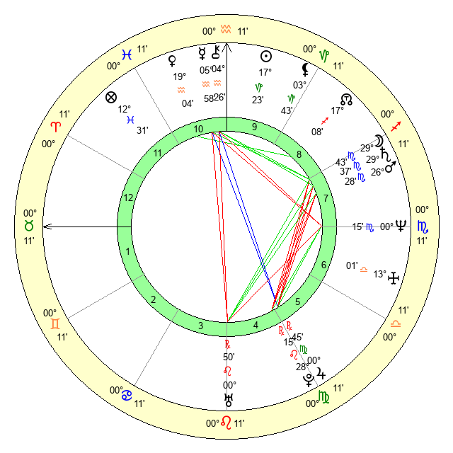 | Moon | 29 Scorpio 41 | 26 Virgo 12 | 15 Gemini 1 |