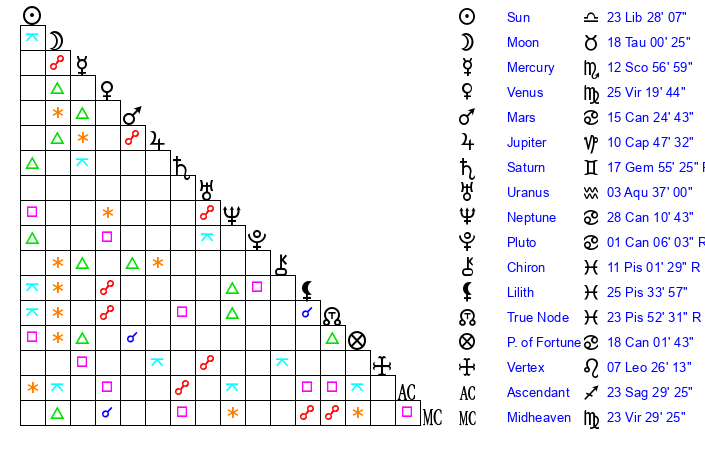 | Moon | 18 Taurus 5 | 8 Virgo 46 | 21 Gemini 31 |