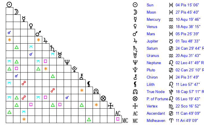 | Sun | 4 Pisces 15 | 5 Pisces 3 | 19 Gemini 54 |