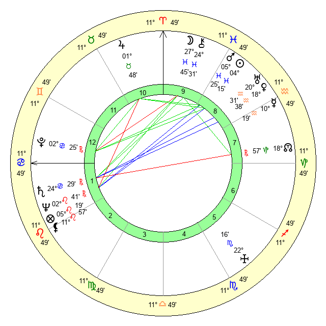 | Saturn | 25 Cancer 17 | 19 Pisces 56 | 29 Cancer 10 |