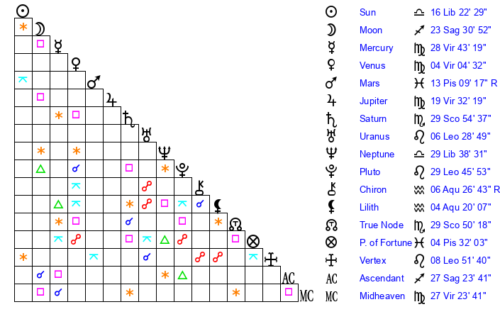 | Neptune | 29 Libra 38 | 0 Aries 18 | 1 Scorpio 59 |