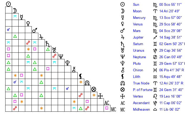 | Sun | 0 Scorpio 55 | 1 Scorpio 32 | 25 Aquarius 25 |