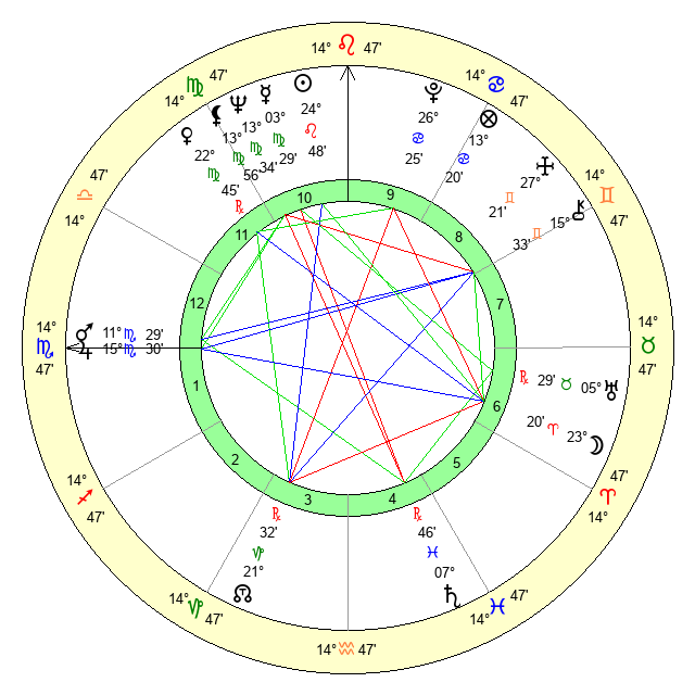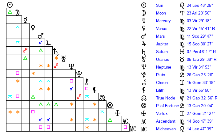 | Sun | 24 Leo 48 | 26 Leo 0 | 23 Scorpio 24 |