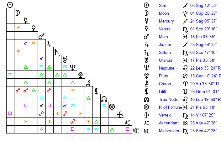 | Mercury | 24 Sagittarius 6 | 20 Scorpio 47 | 22 Pisces 30 |