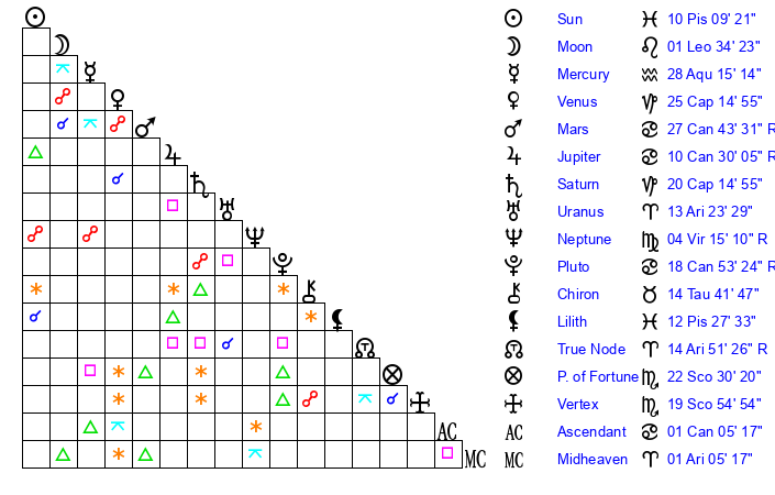 | Pluto | 18 Cancer 53 | 2 Aquarius 54 | 19 Cancer 26 |