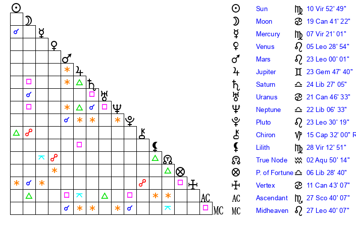 | Mercury | 7 Virgo 21 | 2 Virgo 12 | 22 Scorpio 3 |