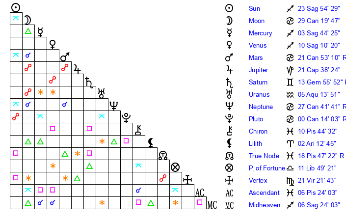 | Venus | 10 Sagittarius 10 | 10 Aquarius 32 | 29 Aries 5 |