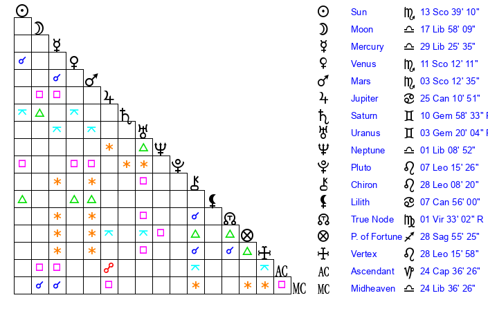 | Sun | 13 Scorpio 39 | 14 Scorpio 32 | 7 Aquarius 55 |