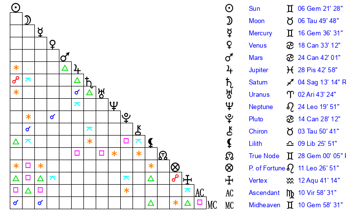 | Mercury | 16 Gemini 37 | 5 Gemini 48 | 11 Virgo 13 |