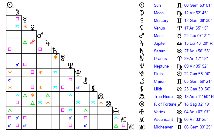 | Neptune | 9 Virgo 35 | 1 Aries 40 | 11 Virgo 34 |