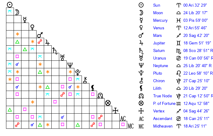 | Sun | 0 Aries 32 | 1 Aries 20 | 9 Gemini 41 |