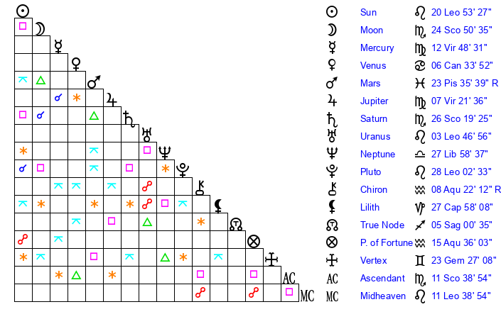 | Sun | 20 Leo 53 | 21 Leo 12 | 28 Libra 16 |