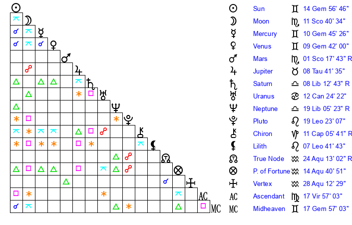 | Moon | 11 Scorpio 36 | 13 Libra 34 | 22 Cancer 56 |