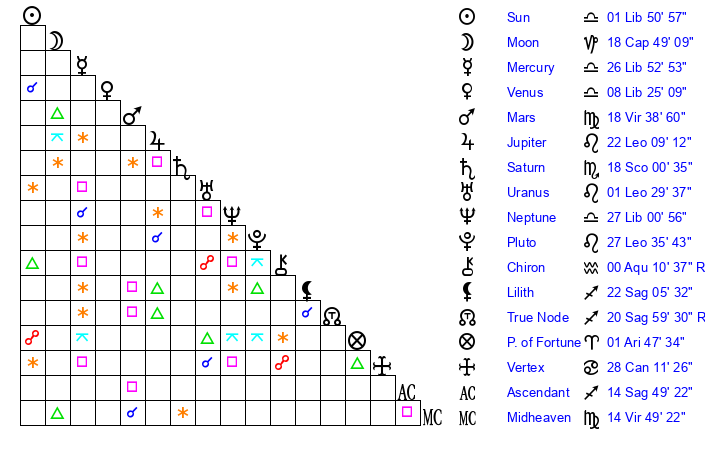 | Neptune | 27 Libra 1 | 0 Aries 41 | 29 Libra 29 |