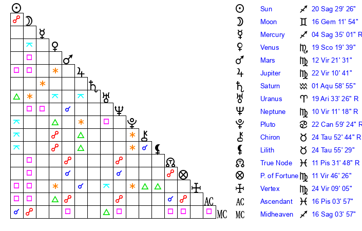 | Moon | 16 Gemini 14 | 0 Libra 27 | 12 Scorpio 18 |