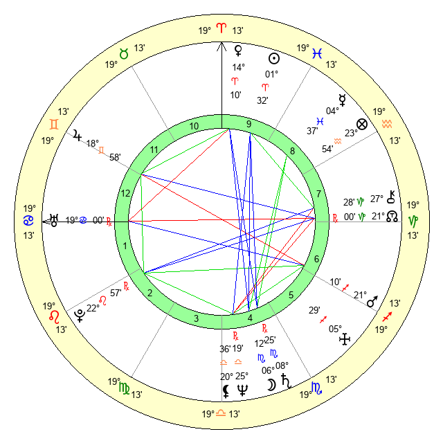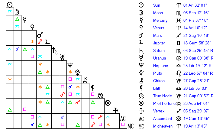 | Sun | 1 Aries 32 | 2 Aries 19 | 10 Gemini 39 |