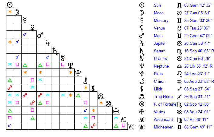 | Sun | 3 Gemini 42 | 4 Gemini 44 | 10 Leo 34 |