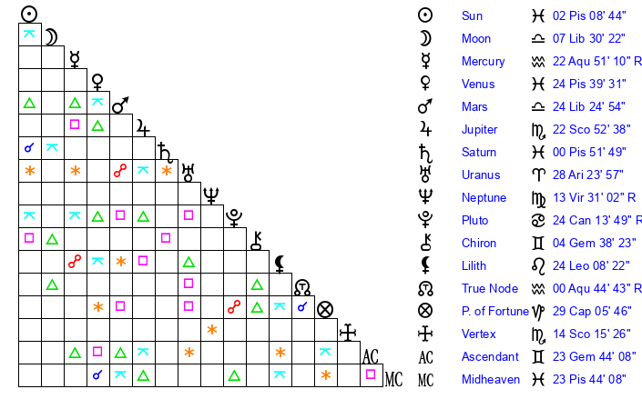 | Sun | 2 Pisces 8 | 3 Pisces 19 | 0 Gemini 40 |