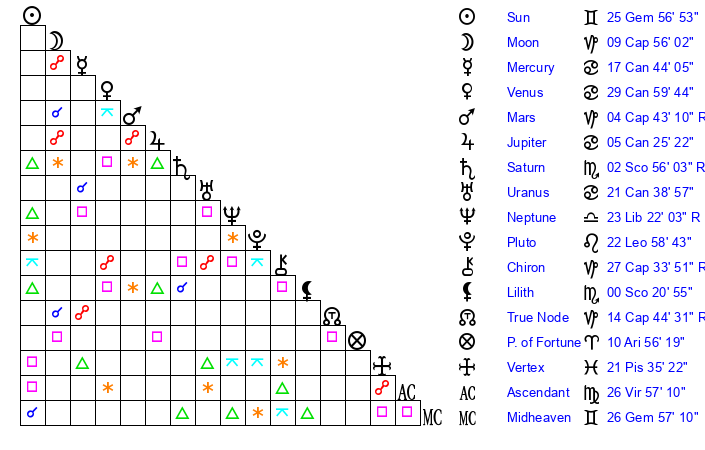 | Moon | 10 Capricorn 4 | 12 Pisces 43 | 25 Leo 11 |