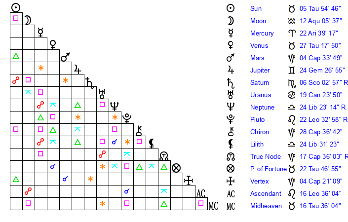 | Venus | 27 Taurus 18 | 27 Pisces 58 | 22 Leo 18 |
