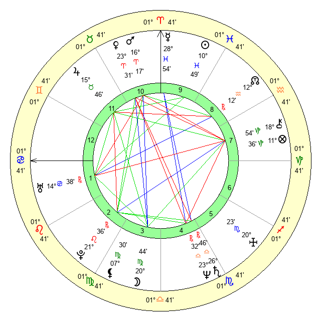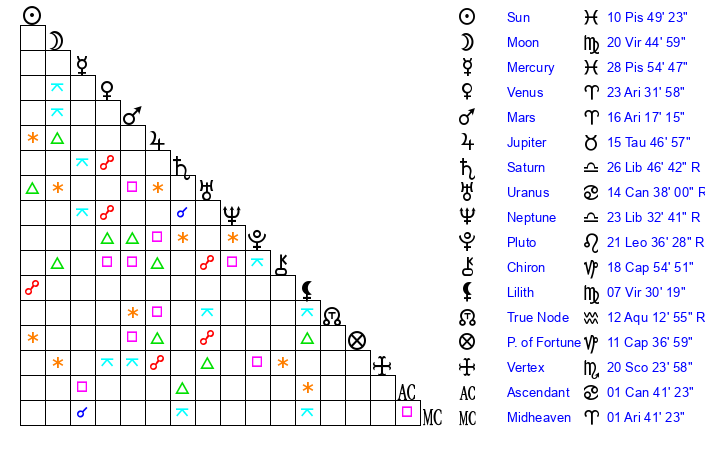 | Saturn | 27 Libra 19 | 20 Pisces 42 | 22 Libra 30 |