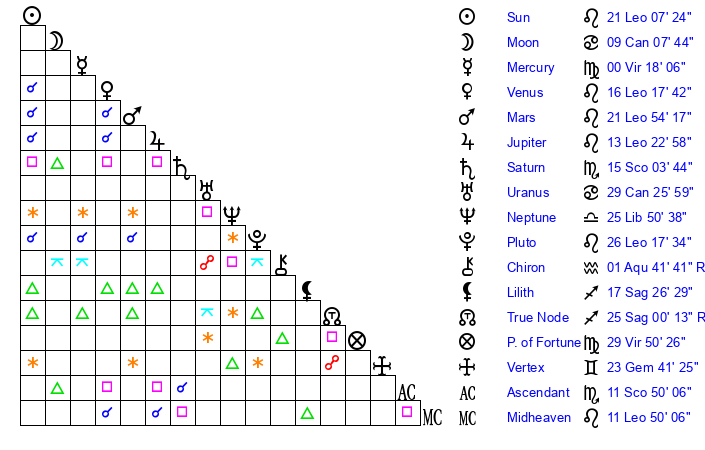 | Venus | 16 Leo 18 | 16 Cancer 59 | 13 Scorpio 19 |