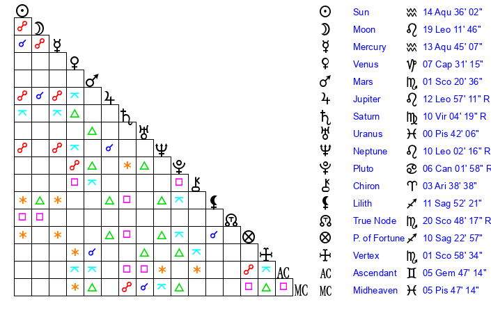 | Sun | 14 Aquarius 36 | 16 Aquarius 8 | 28 Taurus 23 |
