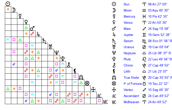 | Neptune | 25 Libra 8 | 29 Pisces 58 | 23 Libra 28 |