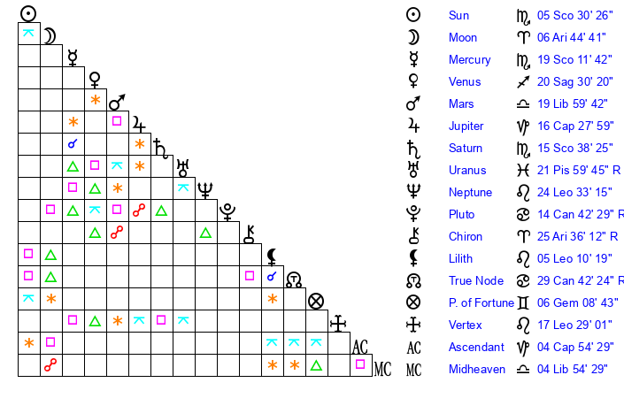 | Sun | 5 Scorpio 31 | 6 Scorpio 16 | 16 Aquarius 55 |
