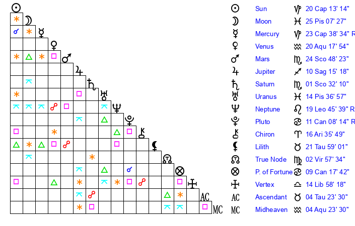 | Sun | 20 Capricorn 13 | 21 Capricorn 44 | 1 Taurus 18 |