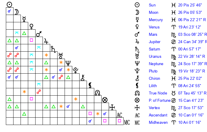 | Pluto | 19 Virgo 18 | 3 Aquarius 9 | 18 Virgo 5 |