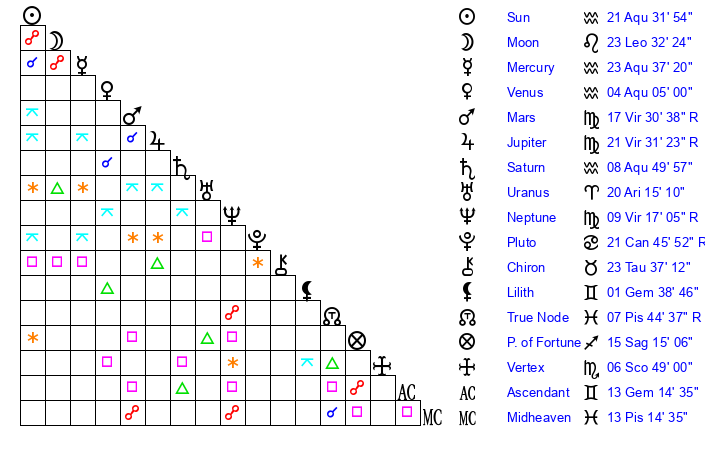 | Saturn | 9 Aquarius 1 | 18 Pisces 26 | 16 Aquarius 24 |
