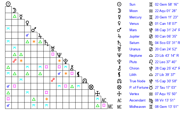 | Sun | 2 Gemini 58 | 3 Gemini 46 | 10 Leo 48 |