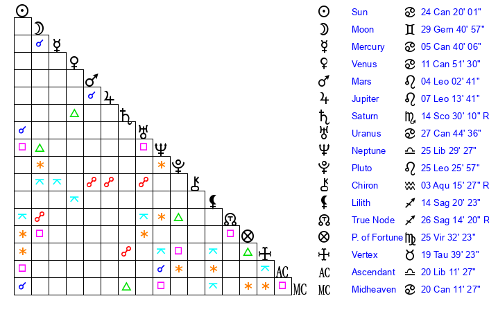 | Uranus | 27 Cancer 46 | 0 Gemini 27 | 1 Leo 31 |