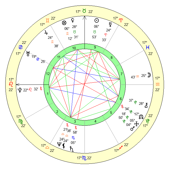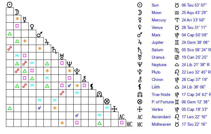 | Moon | 25 Aquarius 41 | 6 Taurus 15 | 11 Libra 12 |
