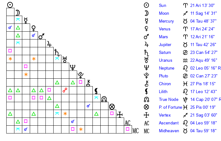 | Sun | 21 Aries 13 | 22 Aries 3 | 5 Leo 0 |