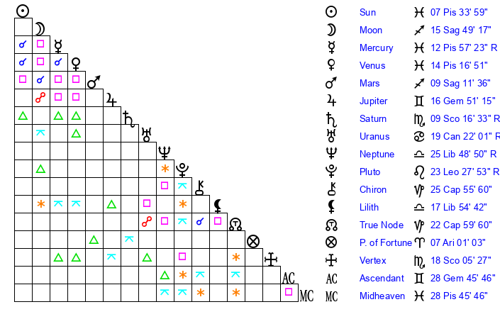 | Mercury | 12 Pisces 57 | 22 Pisces 24 | 17 Taurus 15 |