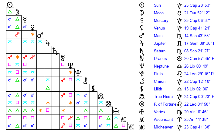 | Moon | 21 Taurus 57 | 27 Cancer 21 | 17 Sagittarius 48 |