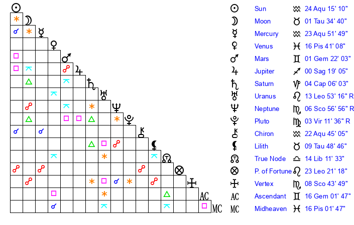| Sun | 24 Aquarius 15 | 25 Aquarius 15 | 29 Aries 52 |