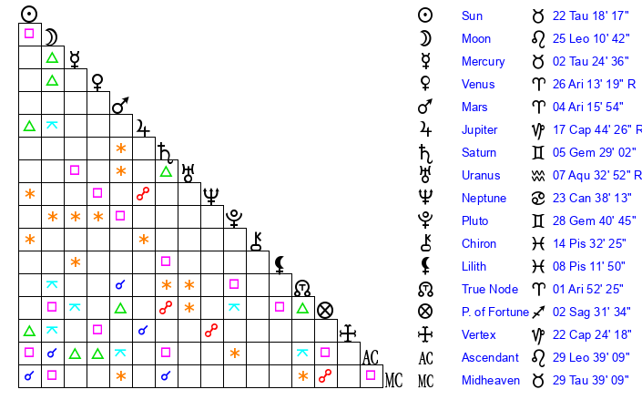 | Sun | 22 Taurus 18 | 23 Taurus 11 | 9 Virgo 35 |