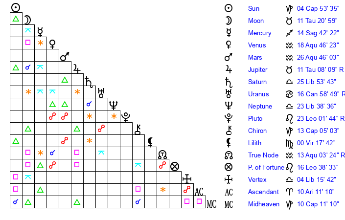 | Sun | 4 Capricorn 53 | 5 Capricorn 10 | 18 Pisces 50 |